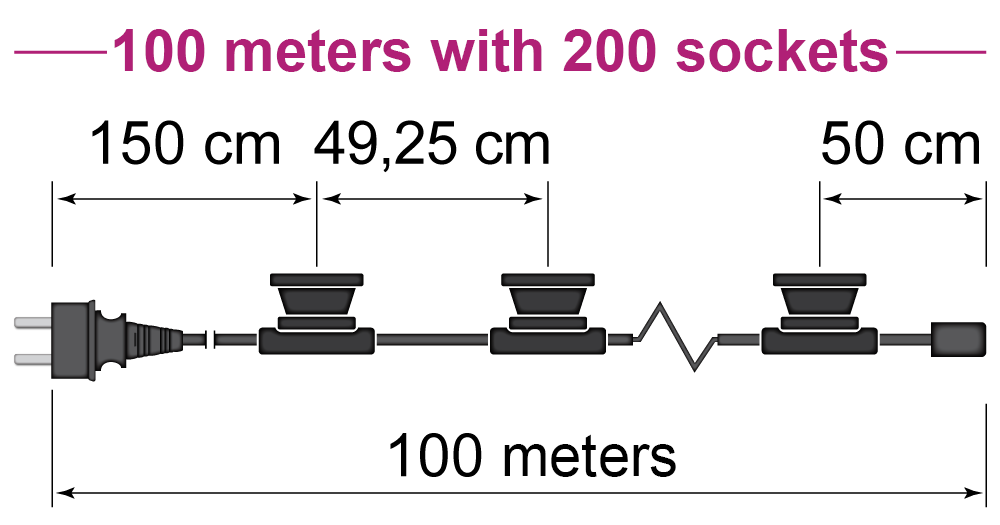 On this page you can find all dimensions of the festoon lights we have in our range. The drawings are sorted by size. At the top you will find the size sketches of the 5-metre-long festoon lights and if you scroll all the way down you will find the size sketches of the 100-metre-long festoon lights.